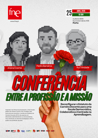 A Federação Nacional da Educação (FNE) organiza no próximo dia 25 de abril, a partir das 10h30, no Auditório do Sindicato dos Professores da Zona Norte (SPZN), a Conferência "Entre a profissão e a missão - Reconfigurar o ECD para uma escola democrática, colaborativa e centrada na aprendizagem".